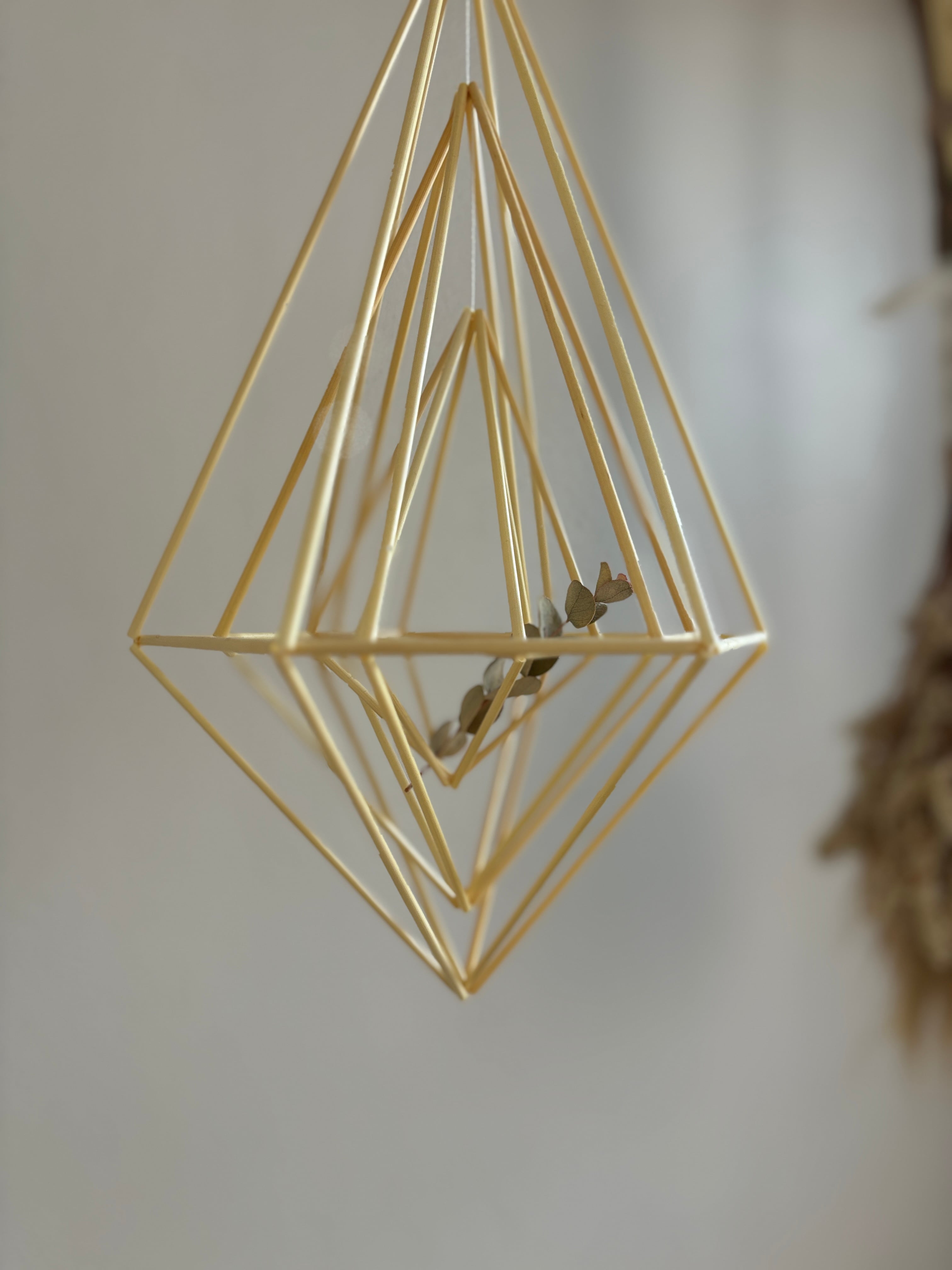 語源はドイツ語やスウェーデン語の【天】からと言われています。風でゆらゆらと揺れ影をおりなすことから「光のモビール」とよばれています。麦のもつやさしい風合い、幾何学模様がおりなす神秘的な美しさは、見る人の心を掴んで離しません。その後キリスト教と共にクリスマスやインテリアの装飾として拡がり、現代では世界中で親しまれています。麦わらや葦などの自然素材だけでなく、ストローや真鍮など様々な素材で作られています。